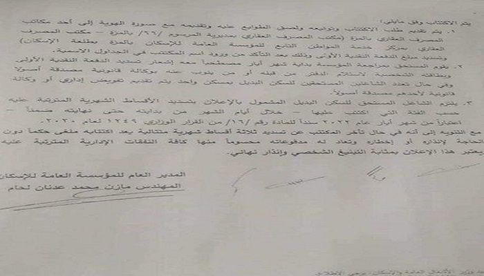واشارت المؤسسة انه في حال تاخر المكتتب عن تسديد ثلاثة اقساط شهرية متتالية يعد اكتتابه ملغى حكما دون الحاجة لانذاره او اخطاره وتعاد له مدفوعاته محسوما منها كافة النفقات الادارية المترتبة عليه كما ويعتبر هذا الاعلان بمثابة التبليغ الشخصي وانذار نهائي .