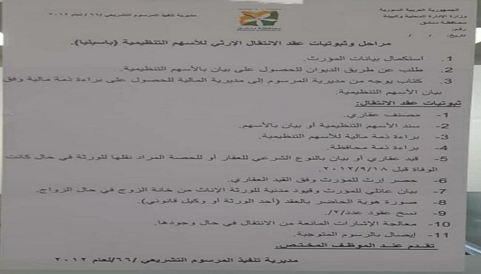 حددت محافظة دمشق مراحل وثبوتيات عقد الإنتقال الإرثي للأسهم التنظيمية لمنطقة باسيليا سيتي والذين ورثو اسهمهم