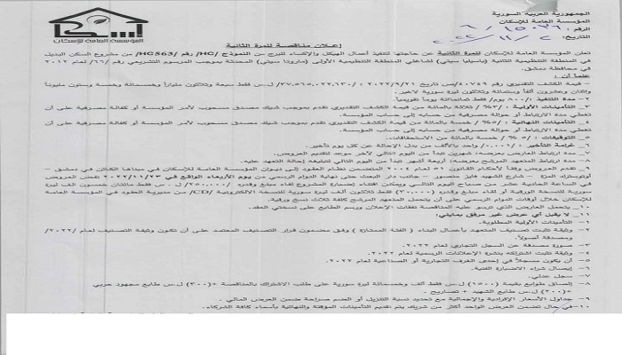 أعلنت المؤسسة العامة للإسكان مناقصة للمرة الثانية لتنفيذ المقسم Hc563 من مقاسم السكن البديل بباسيليا سيتي بقيمة ٣٧،٥ مليار ليرة تاريخ المناقصة للمرة الثانيه