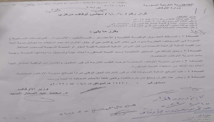 أصدرت وزارة الاوقاف قرارا وافقت فيهه على اسقاط إشارات الأوقاف العقاريه بعد دفع ٥% من القيمة الرائجة للعقار لمديريه الاوقاف التابع لها العقار في المناطق التنظيمية متل ماروتا وباسيليا.