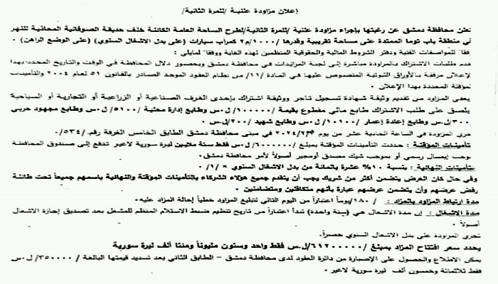آخر الاخبارأقتصاد العاصمةأهم الاخبار محلات للاستثمار في دمشق By admin Last updated يناير 12, 2024 0 99 Share أخبار ماروتا ..أعلنت محافظة دمشق عن مزاد علني لاستثمار محلات ضمن نفق الهمك ومحلات في توسع الحسينية على بدل ايجار سنوي ومزاد علني لاستثمار مرآب الصوفانية وساحة خلف حديقة الصوفانية . 0 99 Share FacebookTwitterWhatsAppFacebook Messenger